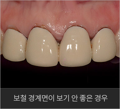 앞니는 어금니와 달리 외부로 드러나 보이기 때문에 심미적인 치료가 매우 중요합니다. 그렇기 때문에 기존의 적절하지 못한 보철물로 인해 보기에 좋지 않거나 잇몸 건강에 문제가 있는 경우에는 심미적인 앞니의 재보철이 필요합니다. 기존 앞니 보철물이 주변 치아나 잇몸과 조화롭지 않거나, 형태, 크기 등이 부자연스러운 경우, 재보철 치료를 통해 자연스럽고 심미적인 앞니를 만들어 줌으로써 일상 생활에서의 자신감과 좋은 인상을 심어 줄 수 있습니다.