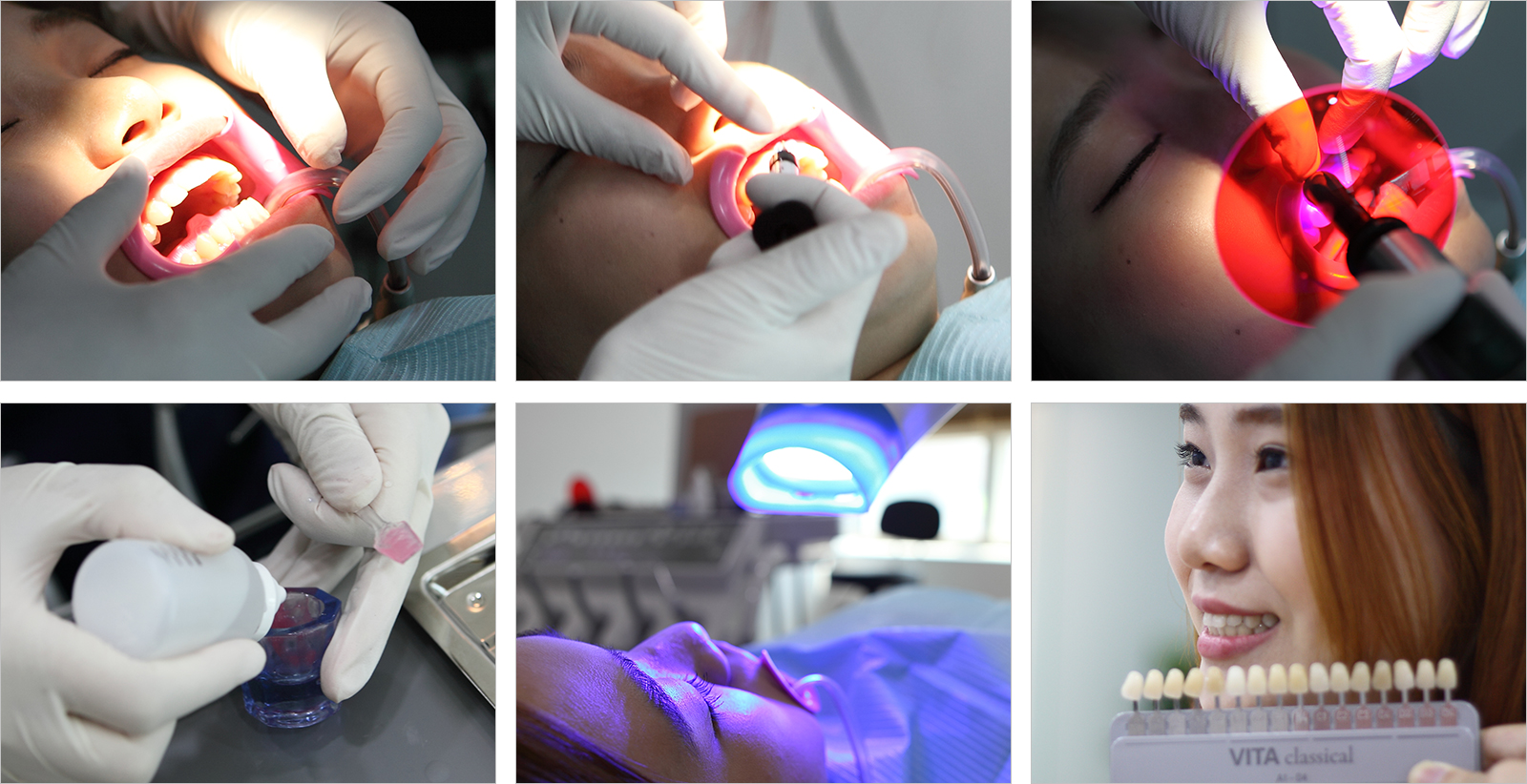치과에서 시행하는 미백방법으로 의료진에 의해 미백약제의 농도와 도포시간을 조절하고 특수광선으로 약제를 활성화 시키는 시술방법입니다. 이러한 치아미백은 1회 20~30분 가량 소모되며 2~3회 정도의 시술이 필요합니다.