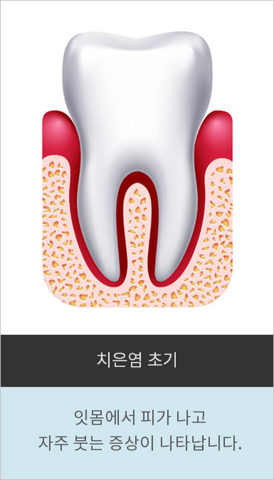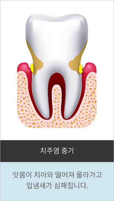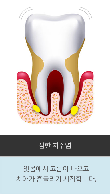 치주질환은 유병률이 높은 만성질환 가운데 하나로, 소리 없이 진행되는 경우가 많아서 병원을 찾았을 때는 이미 잇몸병이 상당히 진행된 경우가 많습니다. 잇몸질환은 치석이 쌓여 염증을 유발하는 질환으로 초기에는 잇몸이 붓고 피가 나면서 입냄새를 유발하지만, 심해지면 잇몸이 내려앉아 치근이 드러나면서 치아가 흔들리기 시작합니다. 그리고 결굴에는 치아가 빠지는 심각한 치과 질환입니다.